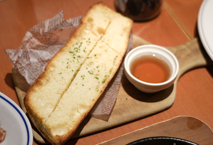 チキン、ソーセージ、ベーコンという食べ応えのある3種のお肉を贅沢に使用し、ニンニクの香りが食欲をそそるアヒージョ。ボリューム感と香りの良さが際立つ一皿で、お肉がそれぞれ異なる食感と風味を楽しませてくれるだけでなく、ニンニクとローズマリーの香りが食欲を一層かき立てます。そして、添えられたバゲットにきびオリゴをかけることで、ほのかな甘みが加わり、コク深い味わいに変化するのが面白いポイントでした。