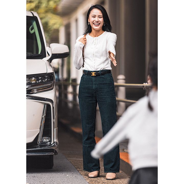下のきょうだい2人を連れての車送迎なので、乗り降りがしやすく子育て中でもストレスフリーなデニム頼り。デニムをきれいめに穿くためには、ベルトでメリハリをつけるのが私的マスト。スタミキのデニムは後ろスリット入りの変化球デザインがお気に入り。3人の子育て中ですが、オシャレを諦めたくない今の気持ちに寄り添ってくれます。