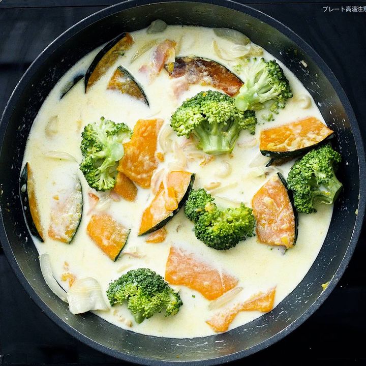 3: ブロッコリー、牛乳、コンソメ、塩を入れて中火でフタをし、時々混ぜ合わせながらとろみがつくまで煮詰めます。