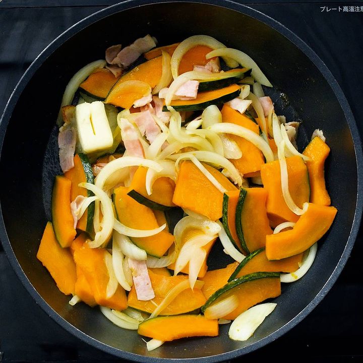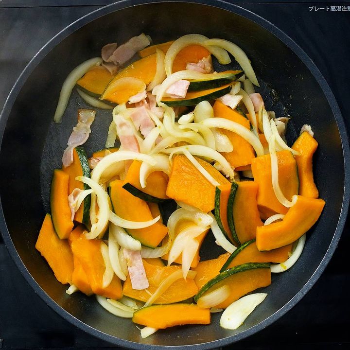 1: フライパンにオリーブオイルを引いて熱し、かぼちゃ、玉ねぎ、ベーコンを加えて、玉ねぎがしんなりするまで炒めます。