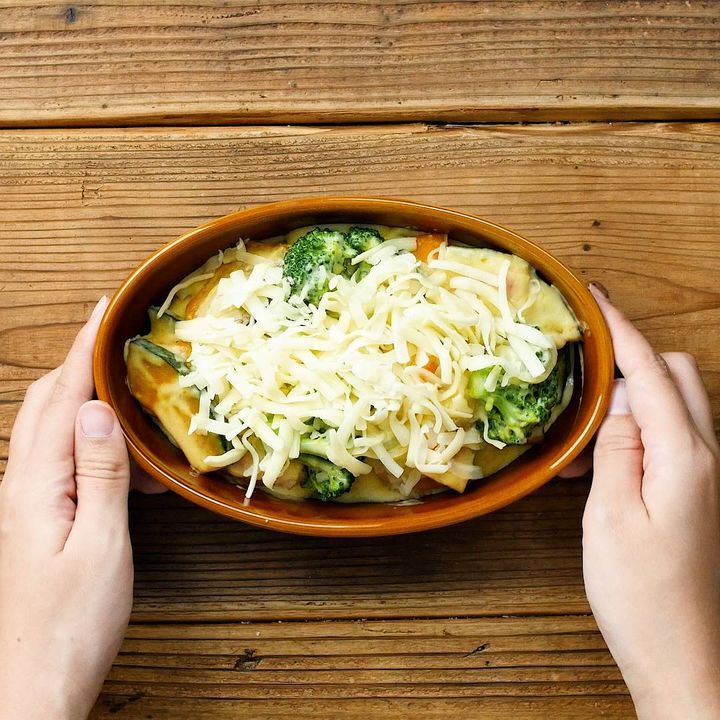 4: 耐熱容器に入れ、とろけるチーズをのせて、トースター250℃で10分加熱して完成です。