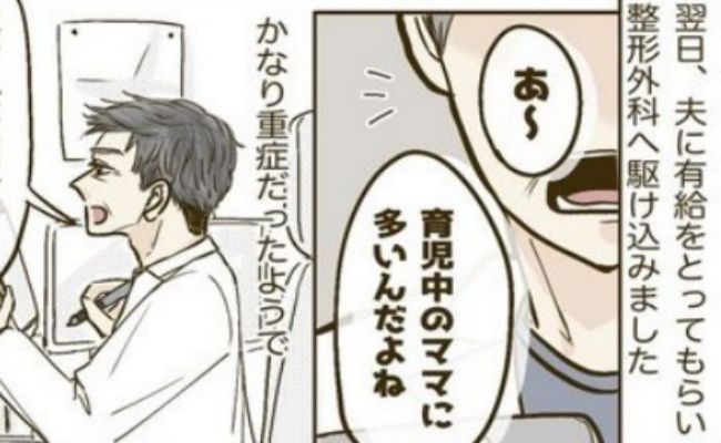 そしてその日は何とか過ごし、翌日夫に有給をとってもらい整形外科に駆け込みました。先生に診察してもらうと、「あ~。育児中のママに多いんだよね」とのこと。長年の抱っこで筋肉を痛めてしまっていたのです。かなり重症ということで、痛みの部分に注射をして定期的に通院することになりました。