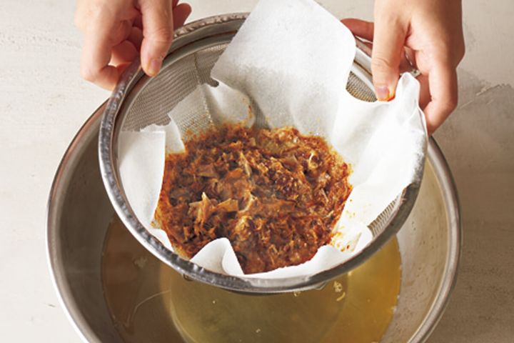 別のボウルにざるとペーパータオルや布巾を敷いて2を注いでこす。