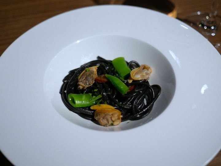 人気メニューの一つ、イカ墨を練り込んだパスタ。これなら歯が黒くならないから、安心して食べられます(笑)