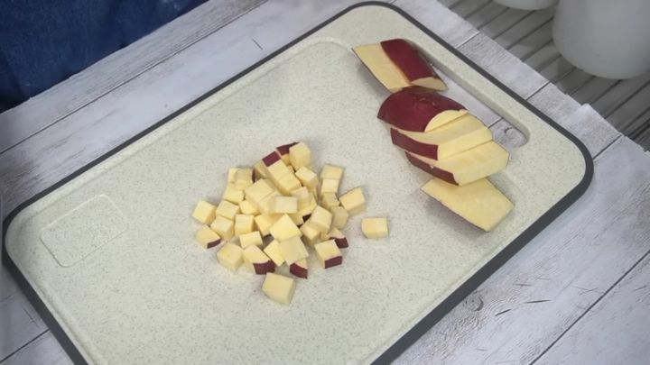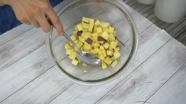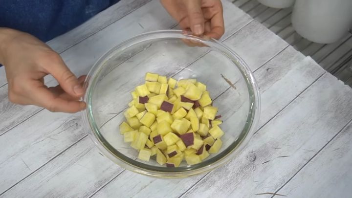 さつまいもは皮つきのまま1cm角の大きさに切っておきましょう。