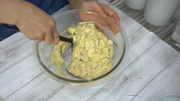生地にさつまいもと黒ごまを入れ、さらに混ぜ合わせます。