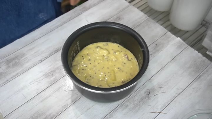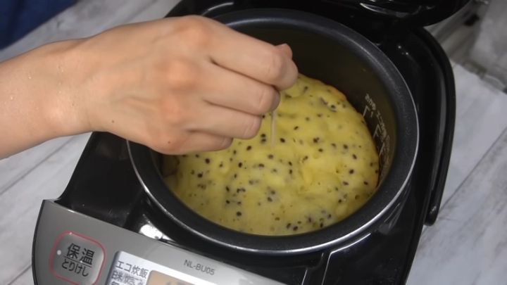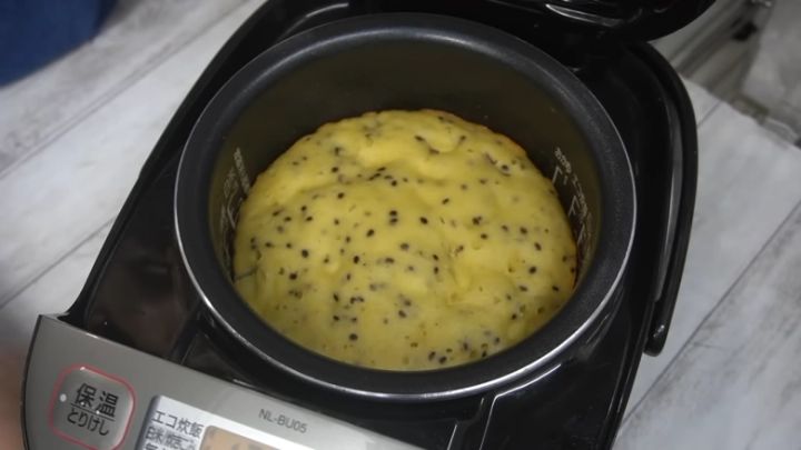下準備しておいた炊飯器に生地を流し入れましょう。炊飯器を少し揺らし、生地が平らになったら、加熱の工程へ。通常炊飯で火を入れていきます。