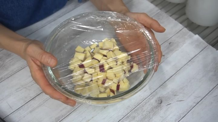 切ったさつまいもはボウルに入れ、5分程度水にさらし、あくを抜いておきます。