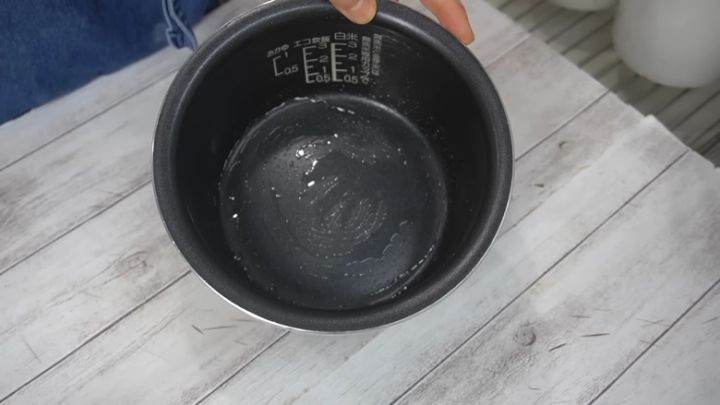 まずは下準備から。炊飯器に分量外のサラダ油を入れ、キッチンペーパーなどで満遍なく広げておきましょう。