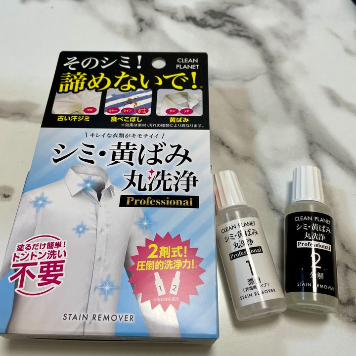 漂白剤と分解浸透ブースターの2つの液剤でシミをとる、初めて使うタイプの染み抜き剤に興味津々。