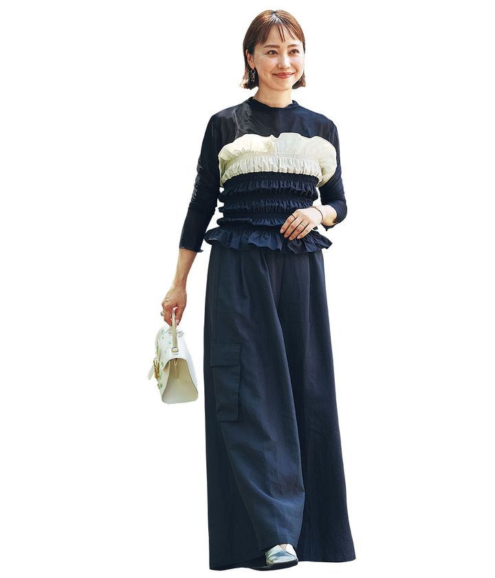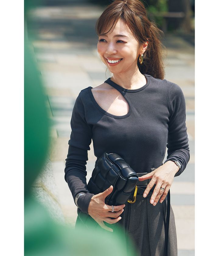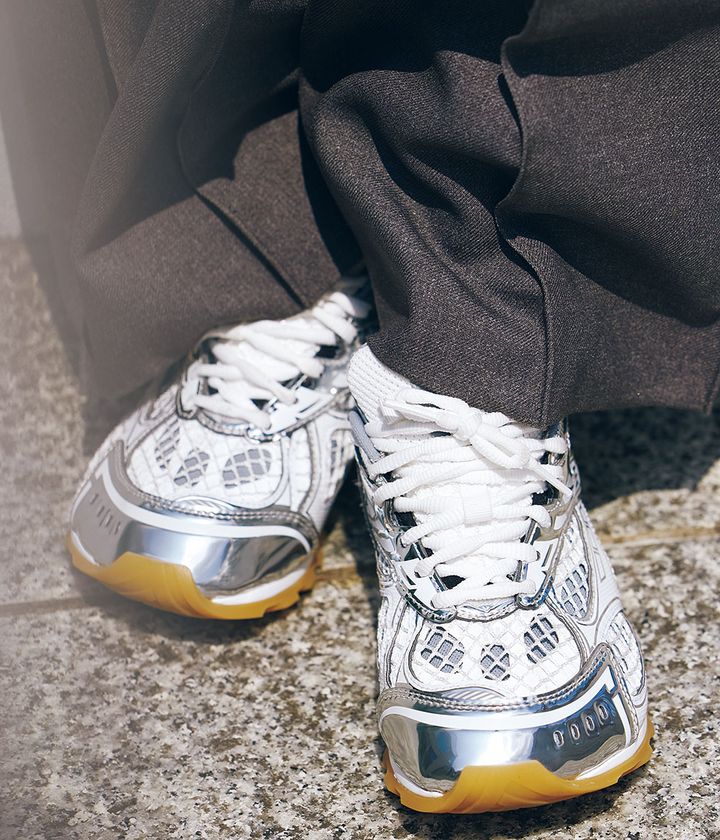 クラシックなシルエットと、グッとエッジの効いたデザインに一目惚れ。日本では見つからないデコルテの開き具合がツボでした。トップスにフィット感があるので、ワイドパンツを合わせてバランスを。ゴールドをちりばめてコーデを引き締めます。ハイテクスニーカーがコーデのハズし役に。