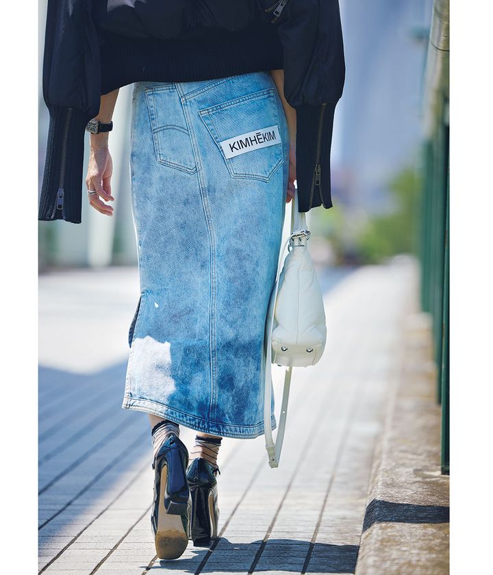 韓国ブランドならではの遊び心が詰まったデザインが特徴でデニムの支持率大。キレイめにもモードにも振れるヘビロテアイテムです。ブランド内で人気のデニムスカートを韓国旅行でGET。ロゴを見せたいので甘めのクロップドトップスが好相性です。Sサイズなので高ヒールでバランスを。