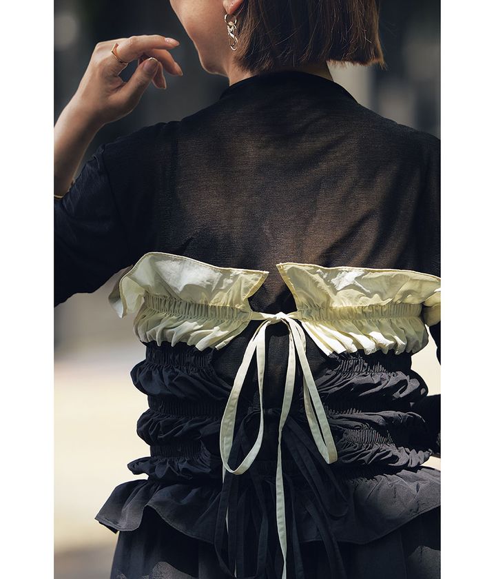 ドラマティックに昇華してくれる主役級ビスチェ。体にフィットする柔らかいシャーリング素材でストレスフリーに着用できるのも嬉しい。友人の韓国土産でもらって知ったKIJUN。韓国ドラマの主人公になれそうな華やかさがたまりません。モノトーンでまとめることで洗練感を。