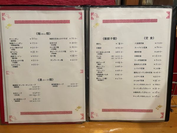 麺類は、チャンポン、皿うどん、焼きそば、ラーメン、担々麺と品数豊富。 定食類も、八宝菜定食、スーパイコ(酢豚)定食、レバニラ定食と、食いしん坊には厳しい選択を迫るラインナップです。 ぎょうざの付いたセットメニューが「ラーメンぎょうざセット850円」と「中華丼ぎょうざセット980円」だけです。 どうしても他のものを頂きたい場合は、セットは諦めてどんどん注文しましょう。リミッターを外すと、選択の幅が広がって楽しみが倍増しますよ!