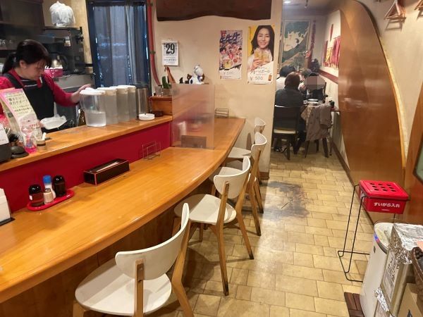 店内に入ると、入口近くに湾曲したカウンターが現れます。カウンターには十分な間隔を隔てて7席あります。カウンターの左奥が厨房で、大将が勢い良く中華鍋を振るっていることが音で分かります。