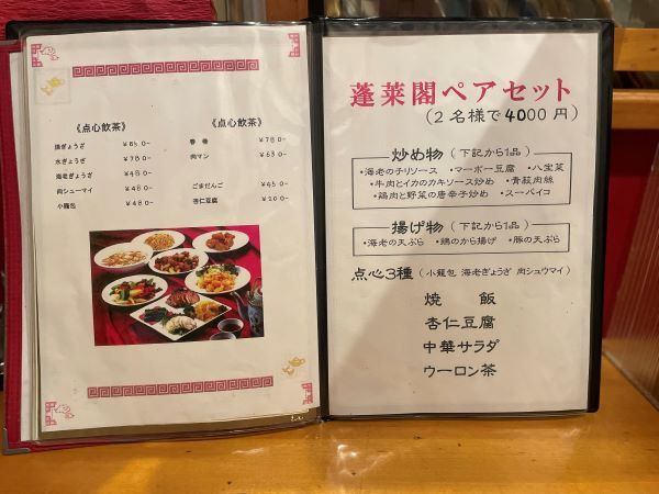 点心飲茶もこれでもか‥とまだまだ続いて出てきます。水ぎょうざ、海老ぎょうざ、肉シューマイに小籠包‥。 メニューを決められない人向けのお助けメニューが、この「蓬莱閣ペアセット」なんでしょね。2名様で4000円、炒め物、揚げ物をそれぞれ一品選ぶと、点心3種に焼飯、杏仁豆腐、中華サラダ、ウーロン茶が付いたフルコース。これは相当お得なメニューです。