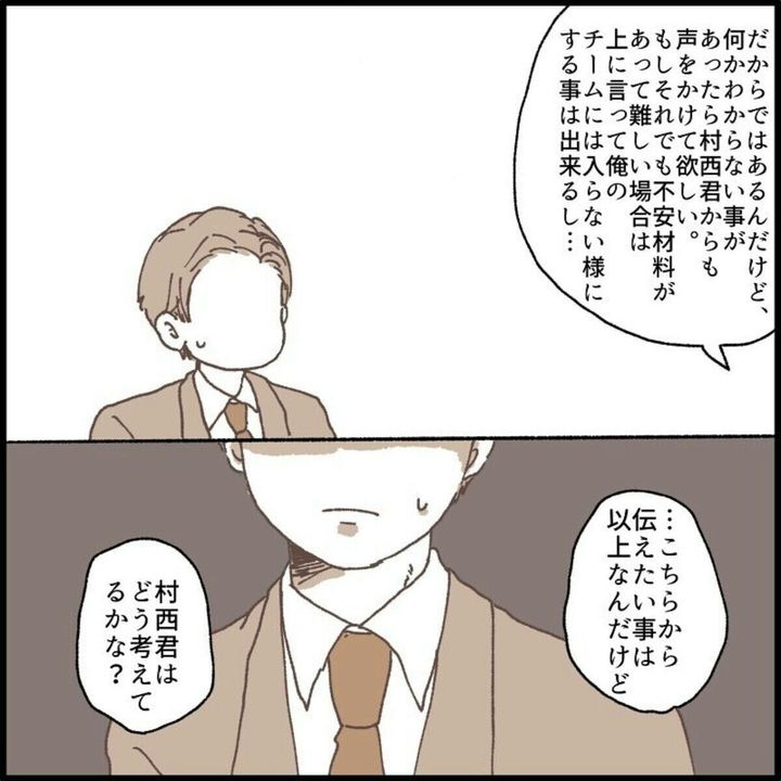 上司の本音を、村西君は終始黙って真剣に聞いているように読み取れます。