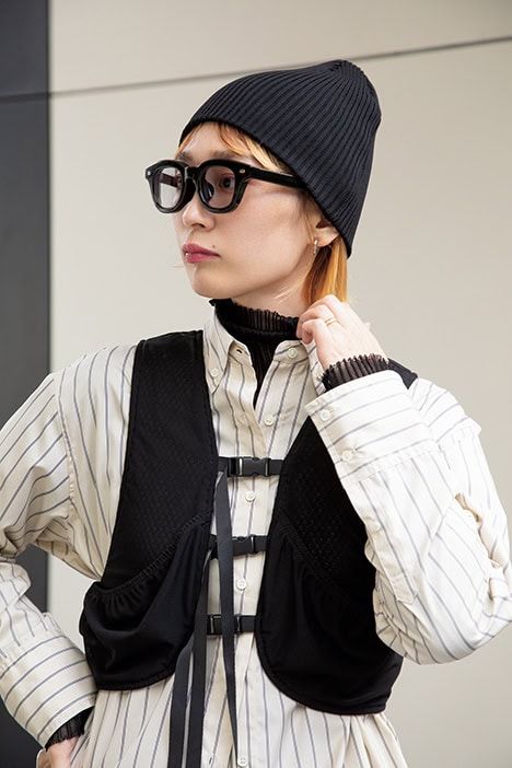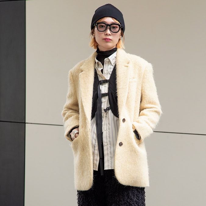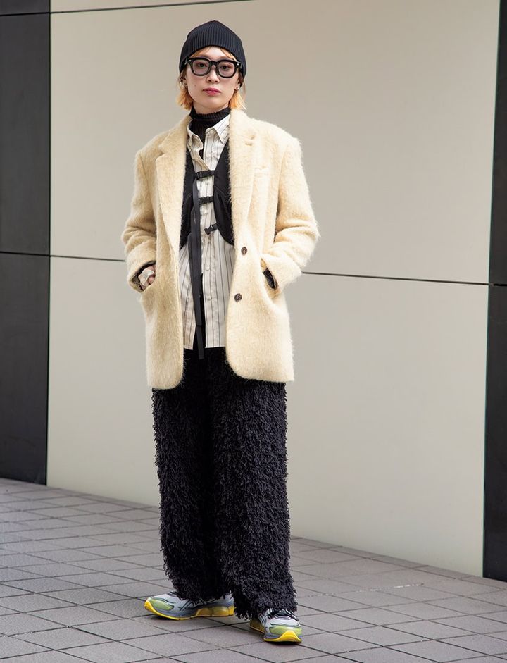 ジャケットコート¥39,600、シャツ¥17,600、タートルニットトップス¥12,650、パンツ¥18,700、ベスト¥17,600、ビーニー¥4,950(全てエミ/エミ ニュウマン新宿)、ASICS×Cecilie Bahnsenのスニーカー、その他は本人私物