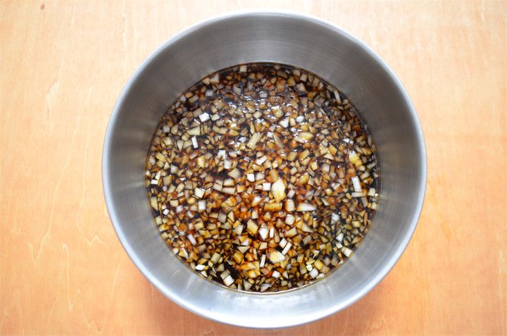 1.玉ねぎをみじん切りにして、[A]の調味料と一緒にボウルに入れ混ぜ合わせる。