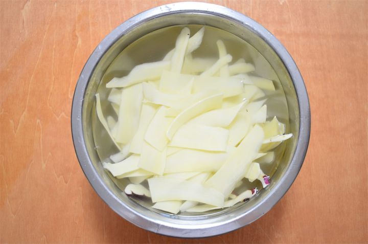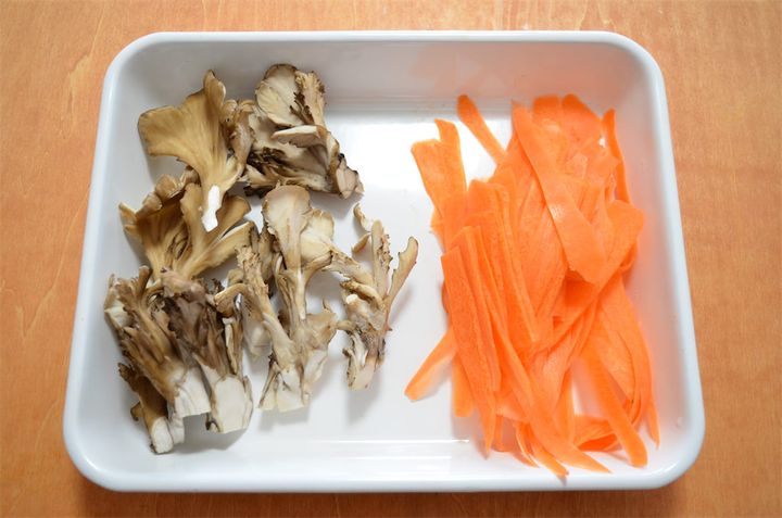 2さつまいもとにんじんはよく洗い、横半分に切り、ピーラーで細長くスライスする。さつまいもは水にさらし、舞茸は好みの大きさに割く。