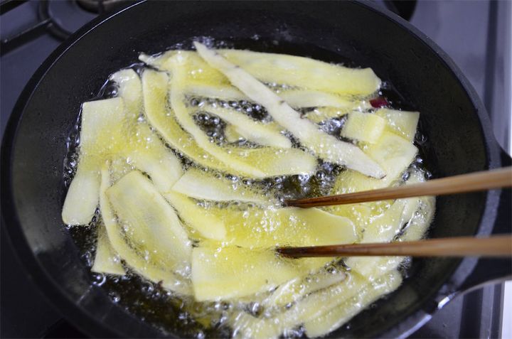 3.さつまいもの水気をキッチンペーパーなどで拭き取り、にんじん、舞茸と一緒に素揚げにする。