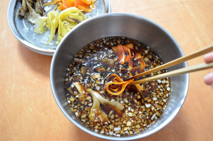 4.油を切った3を熱いうちに1に入れて軽く混ぜ合わせ、5~10分ほど漬ければ出来上がり。
