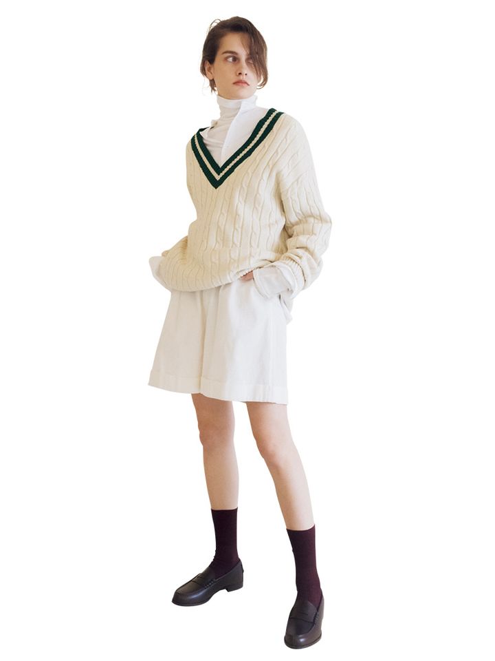 【POINT】さらに重ねたチルデンニットは、Vネックに配したラインで顔まわりがキレよく整い、重ね着が多くなる季節に好都合。インナーもハーフパンツも白でそろえた、清潔感のあるスポーティスタイルは好感度抜群。