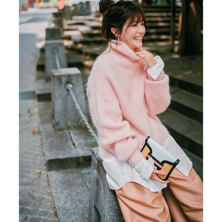 ピンクニット¥49,500(サヤカ デイヴィス/ショールーム セッション)シャツ¥39,600(ATON/エイトン青山)ワイドパンツ¥66,000(コラム/エストネーショングランフロント大阪店)ピアス¥56,200(トムウッド/トムウッド 青山店)バッグ¥70,400(ピエール アルディ/ピエール アルディ 東京)