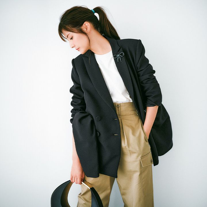 繊細なカットジャカードを使用したブラウスもTシャツ型なら気負わず着やすい。鉄板の黒パンツも今っぽいタック入りのワイドを選んで合わせたワン・ツーコーデでも、ブラウスの甘さで今年らしい雰囲気に。