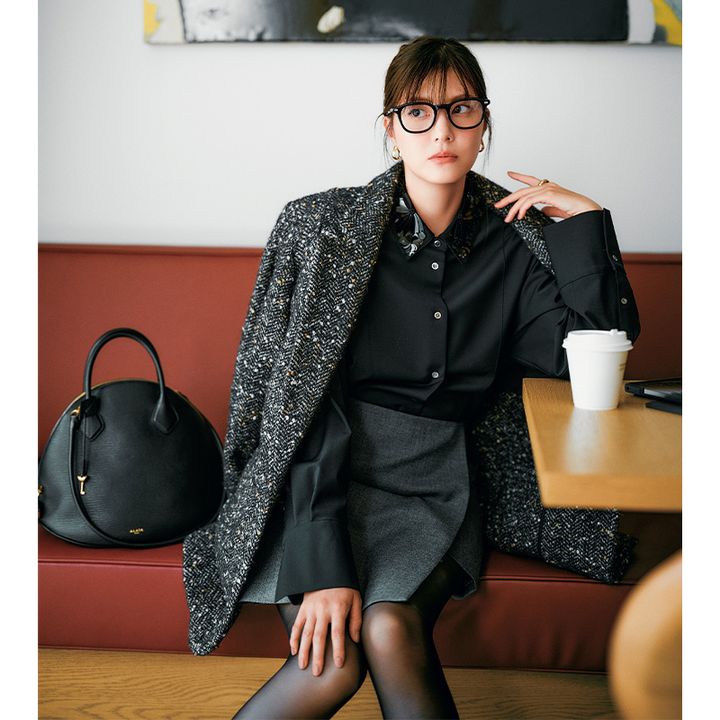 ビジュー衿シャツ¥75,900(エブール/リトルリーグ インク)ジャケット¥128,700(マランエトワール/イザベル マラン 青山店)スカート¥18,700(プラージュ/プラージュ 代官山店)メガネ¥58,300(アイヴァン/アイヴァン東京ギャラリー)ピアス¥44,700リング¥316,000(ともにトムウッド/トムウッド 青山店)バッグ¥531,300(アライア/リシュモンジャパン アライア)その他/スタイリスト私物