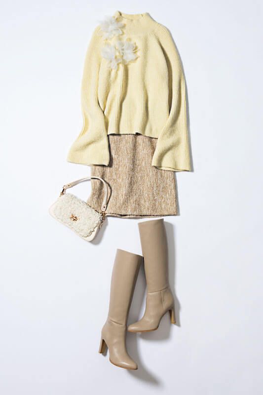 デコラなチュールフラワーでシンプルニットをロマンティックに。立体的なオーガンジーのお花をデコレーションした、今季トレンドのフラワーニット。スカートとブーツをベージュでまとめて、女性らしいニュアンスのある色使いに。