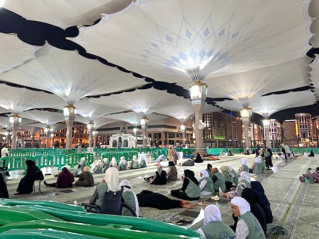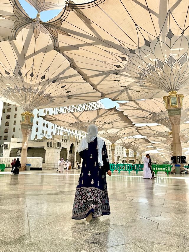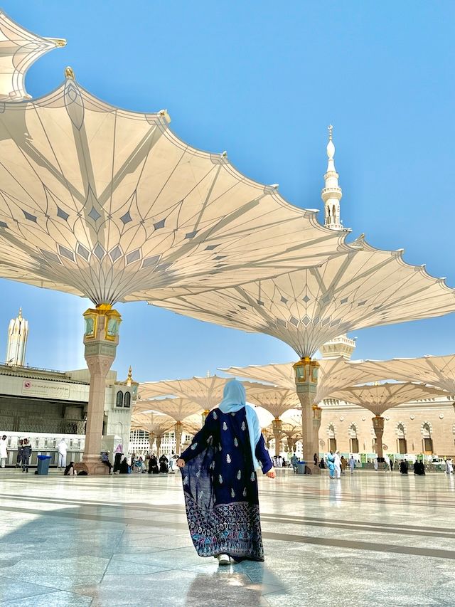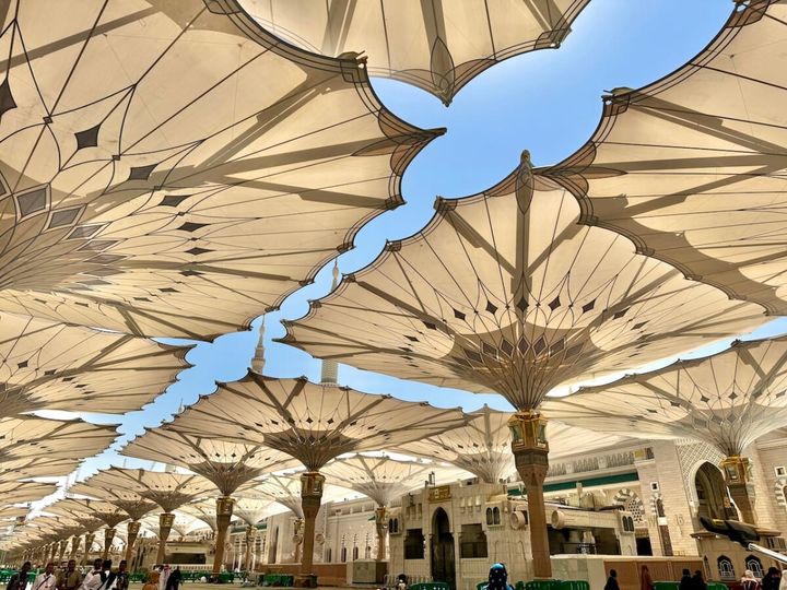 夏になると最高気温が40度を超える日差しの強いメディナでは、外の広場やモスクの中に大きなアンブレラが設置されています。電動で開閉する傘は一辺25.5mもの大きさの正方形で、250基も連なってモスクの美しい景観をつくり出すことで人気です。実は、日本の企業・太陽工業が手がけたものだそう。遠く離れた異国の聖地に日本企業の技が使われているのは嬉しくなります。