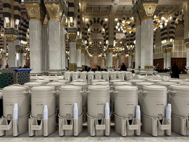聖なる水(ザムザム)の泉がモスク内では提供されています。こちらはメッカからの水が運ばれていて、夜には見かけなかったものの、午前中にはたくさんありました。多くの巡礼者がペットボトルに入れたり、備え付けの紙コップに汲んで喉を潤しておりました。筆者もいただきましたが、冷たくて飲みやすいお水でした。スーパーでも販売されているようなので、お土産で買いたい方にもおすすめ。