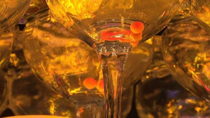 北海道千歳市の水族館では、シャンパングラスのツリーが展示され、訪れた人の目をひいています。