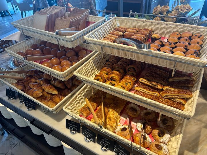 クロワッサンやデニッシュが焼き立てで香ばしい♡ スクランブルエッグやソーセージ、ベーコンもあって王道のホテル朝食を満喫。