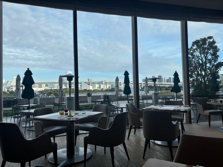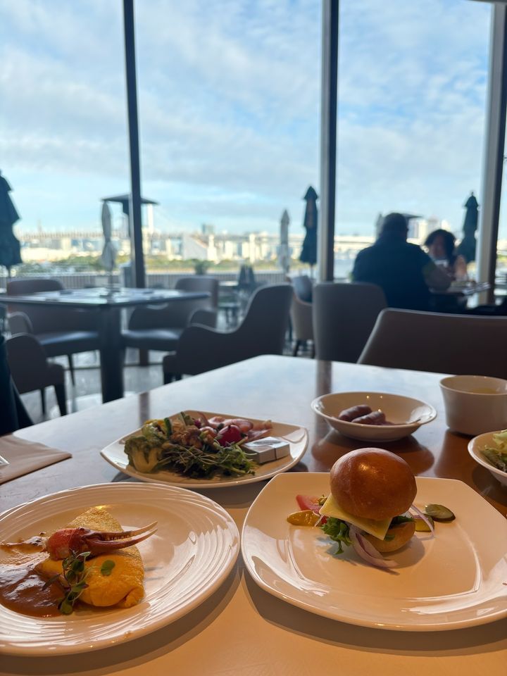 窓際の席からはお台場の海やレインボーブリッジが一望できて、朝からこの景色は贅沢すぎる…。