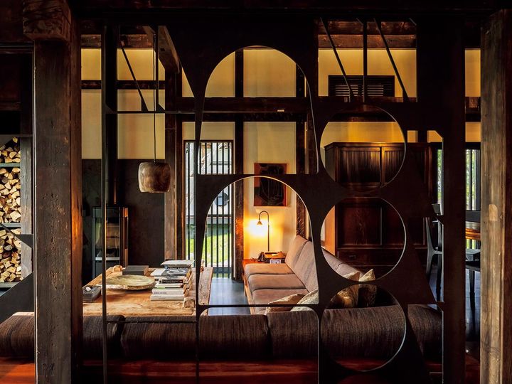 廃材越しに見る「火」のリビングルーム(351㎡)。1泊1室1名¥115,000~(2食付き)。