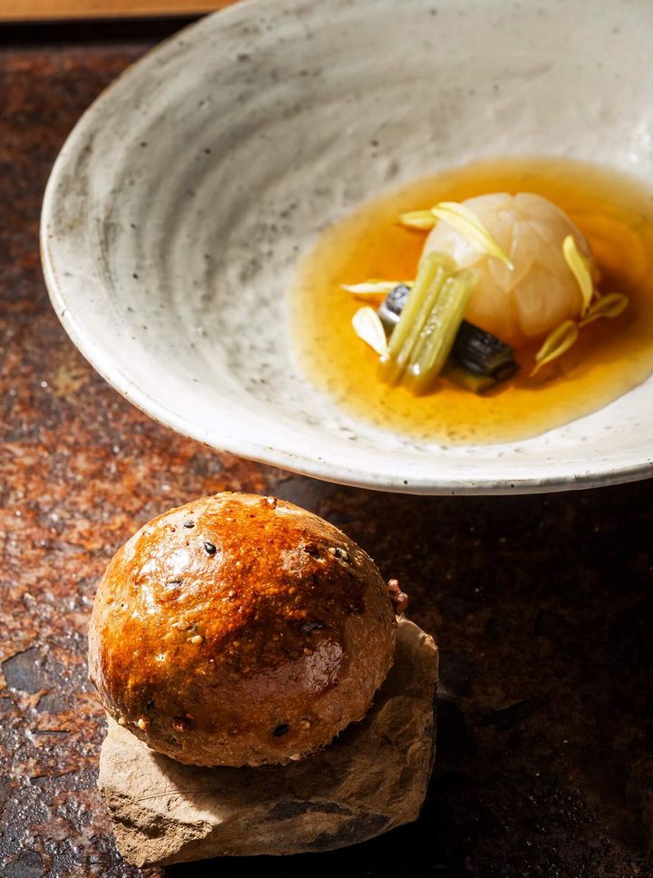「縄文パンと蕪の含め煮入り十勝牛と蝦夷鹿のコンソメドゥーブル」は、山菜のほのかな苦味がいいアクセント