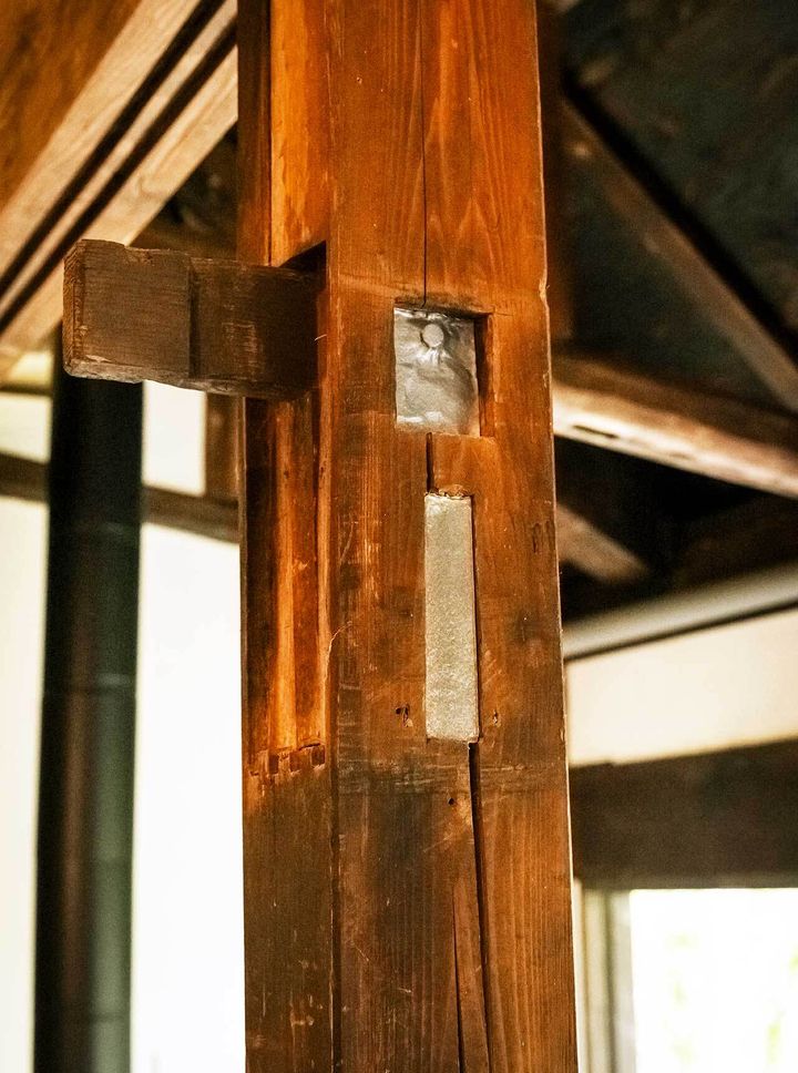 宿名の由来でもある仕口。こちらは客室の柱の一部で、鉛の金継ぎを施している。屋外には仕口のオブジェも