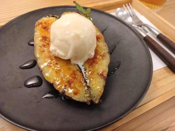 表面はパリパリっ&中はホックホク。オプションのトッピングに、私は豆乳バニラアイスを選びました。豆乳のやさしい甘味であっさりとした風味のアイスに芋の自然な甘みがマッチして心が幸せいっぱいになりました。