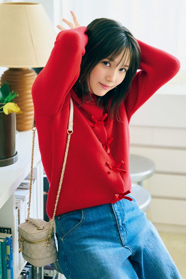 3. リボンモチーフの赤ニットを×デニムでレディカジュに♪〈12/1のコーデ〉