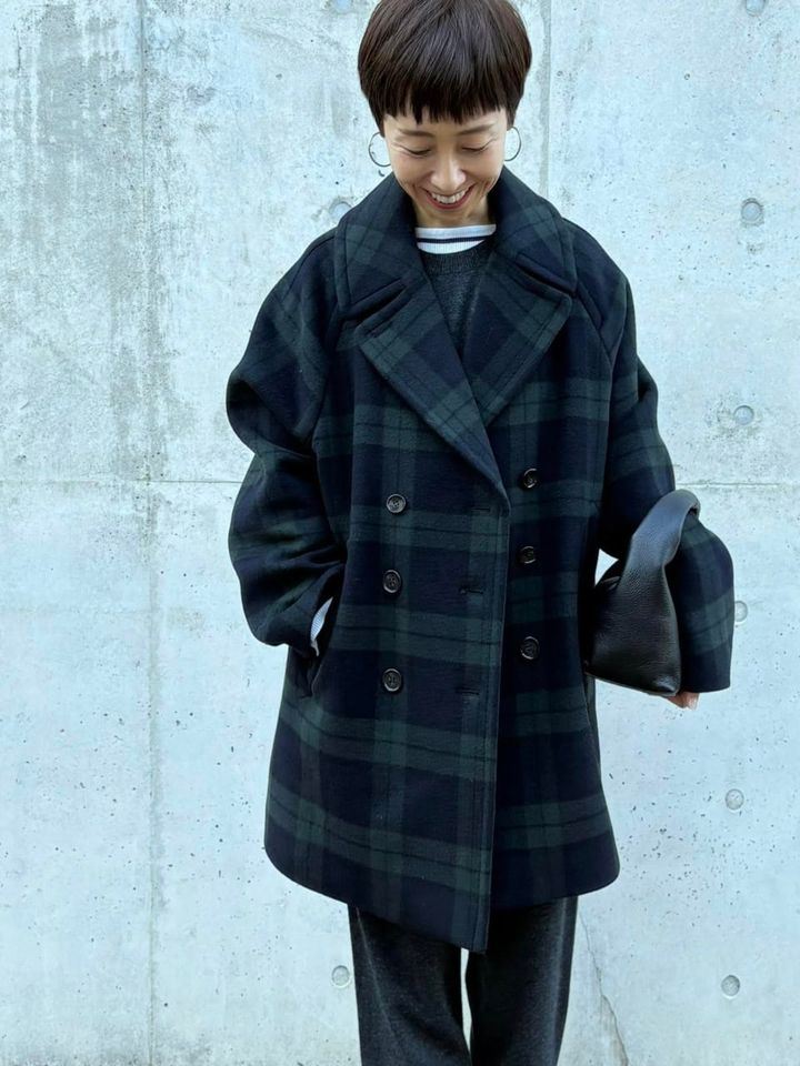 「カラートーンを合わせてアイテムに統一感を持たせました。ラフな印象になりがちなニットのセットアップに、タータンチェックの一種であるブラックウォッチのPコートを羽織ってシックな雰囲気に。トラッド要素の強いPコートですが、ラグランスリーブなのでほどよいヌケ感と女性らしさを演出してくれます」