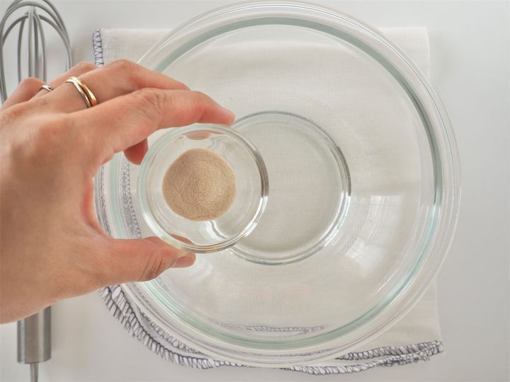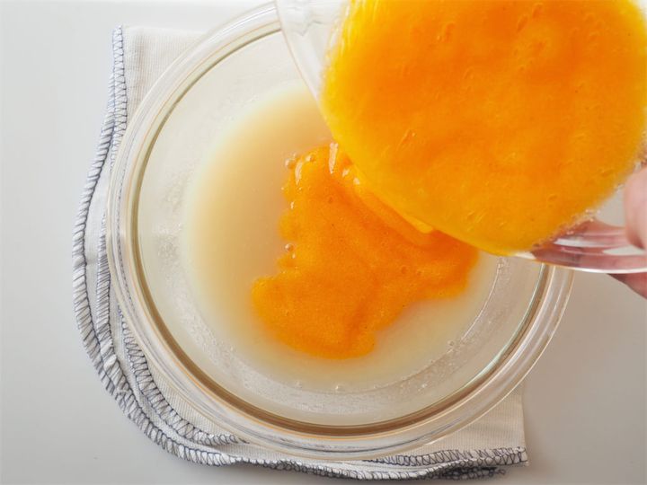 4. 耐熱容器に水、粉寒天を入れ混ぜ、電子レンジで500Wで3分加熱する。