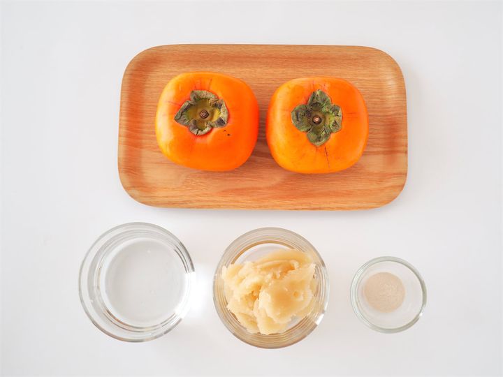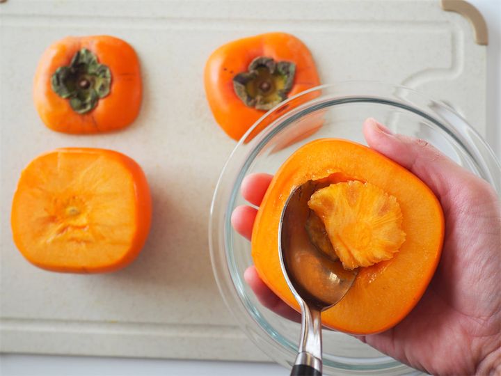 2. 1の柿の果肉をスプーンを使ってくり抜きボウルに入れる。