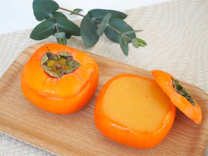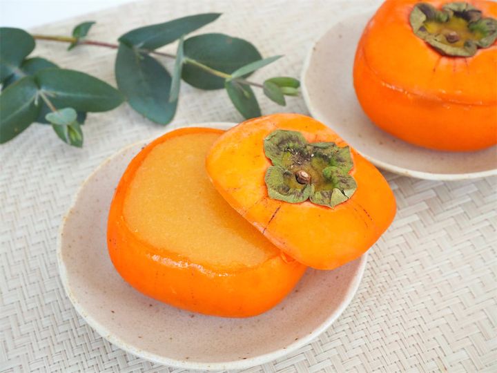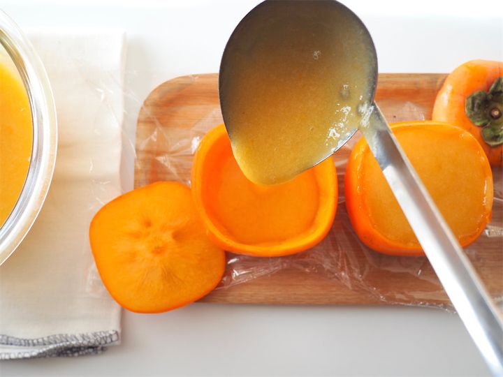 7. 柿の皮の器に6を流し入れ、冷蔵庫で3時間ほど冷やし固めたら完成。