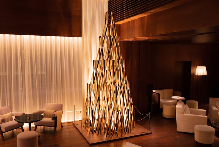 「東京エディション虎ノ門」と「東京エディション銀座」両ホテルのロビーに、日本を代表する建築家の隈研吾氏が手掛けた「家具として生まれ変わり永遠を生きる」クリスマスツリーが登場しました。どちらのツリーも小さな木のユニットを積み上げ、それぞれの街の特色を表現。注目したいのは、ツリーは展示後、隈研吾デザイン、カリモク家具制作のテーブルとして生まれ変わり販売されるということ。環境にやさしいサステナブルなクリスマスツリーです。
