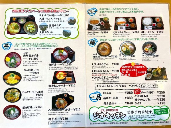 こちらのレストランは、どんぶり館ならではの丼メニューから定食メニューやカレー、喫茶メニューまでいろいろです。 四国西予ジオパークの風景を膳の中に表した“ジオパノラマ膳”というものもありましたよ!!