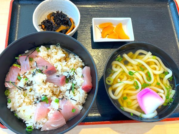 一般的な海鮮丼のようなものを想像していたので、お椀にたっぷりと入ったタレを見て「おおっ!」と思いました。タレは出汁のような感じで全部かけても味が濃くなる心配もなく、お茶漬けのようにひたひたになったごはんと一緒にお刺身がするっと喉を通ります。小うどんも付いていてボリューム的にも大満足、うどんも優しいお出汁でとても美味しかったです!夫よ、ナイス注文間違いでした(笑)