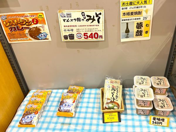 レジ横で販売されていたものの中に、レストランで使用されている味噌やレストランのカレーが売られていましたよ。愛媛と言えば麦みそ!味噌はどんぶり館特製で、当館オリジナル商品の中で最もリピート率の高い人気商品だそうです!!