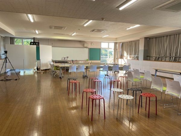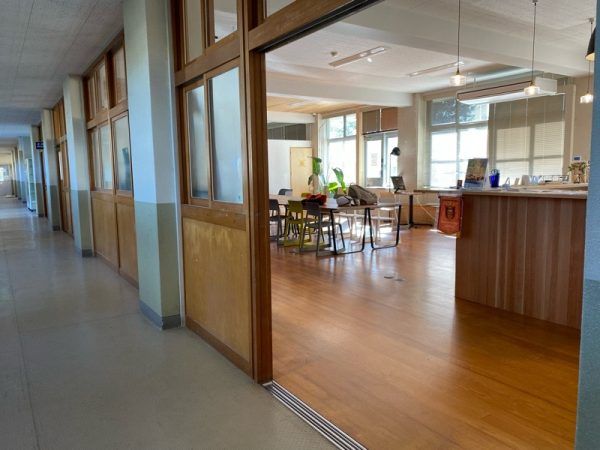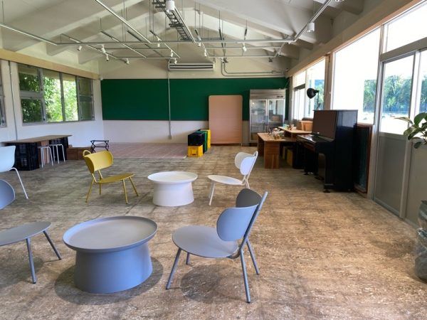 芝生の校庭の一角にある幼稚園の園舎跡がリニューアル。